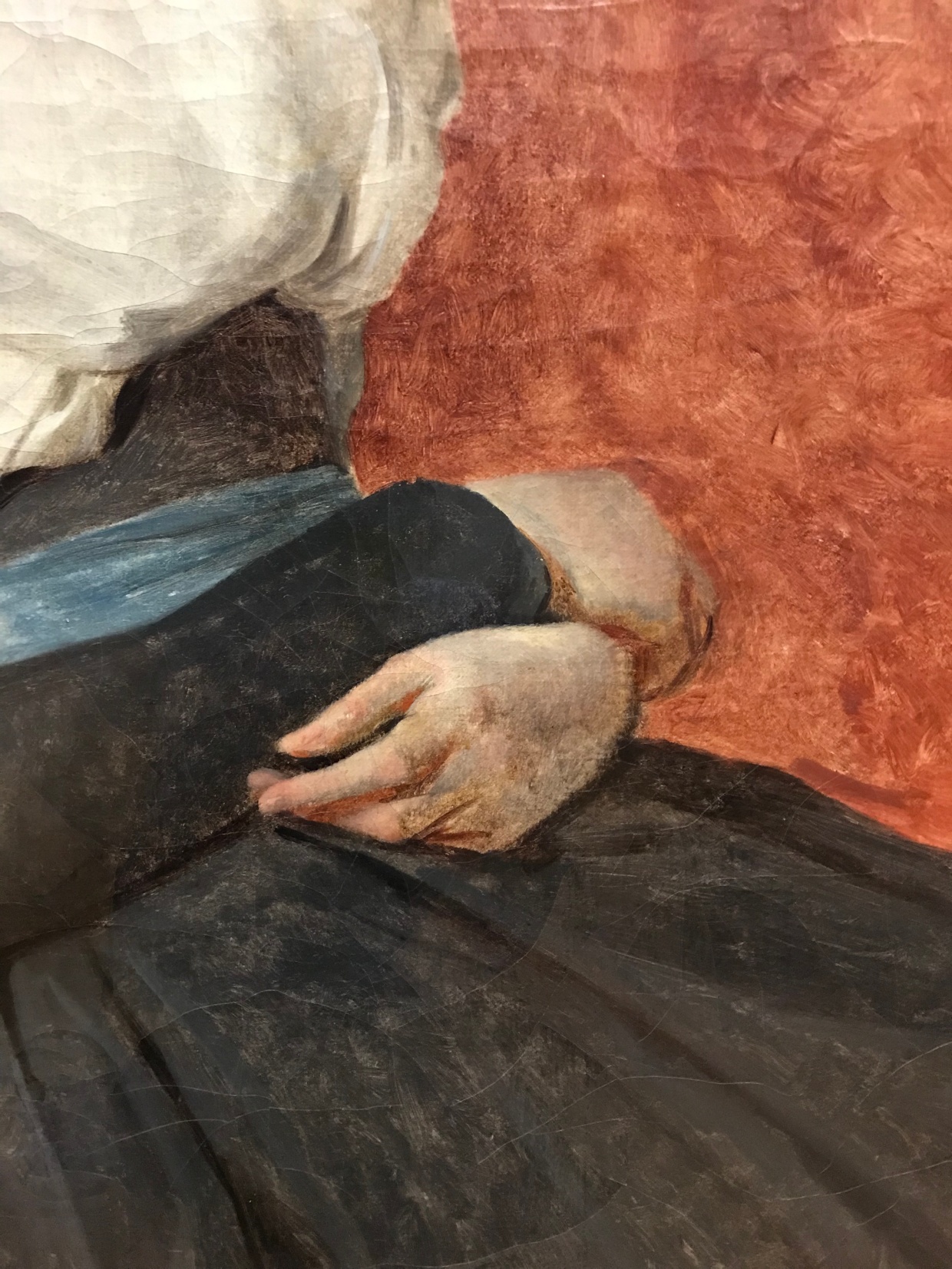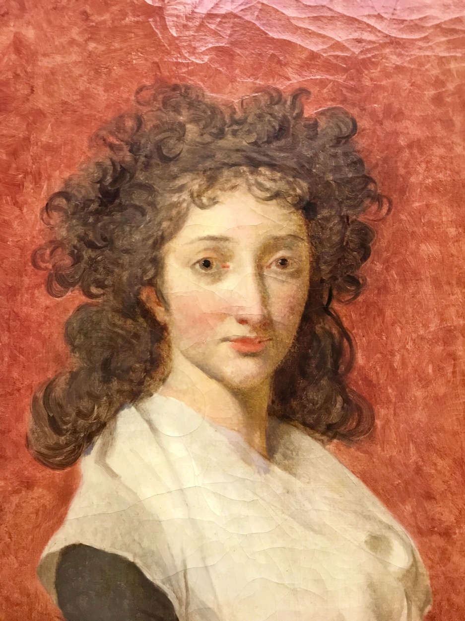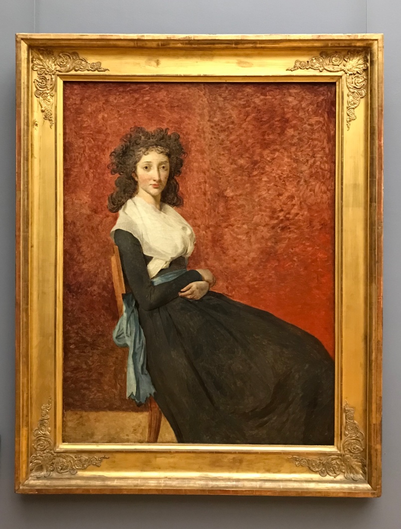 Ten portret przykuł mój wzrok od pierwszego spojrzenia. Przedstawia przerażoną kobietę w skromnym ubraniu, pozbawioną biżuterii i innych ozdób, z niedbałą fryzurą, z dłońmi złożonymi na podołku w geście wyrażającym niepewność lub zagrożenie, ukazaną na niepokojącym czerwonym tle. Powstał w latach 1791 – 1792. Jest przejmującą ilustracją krwawego okresu rewolucji.