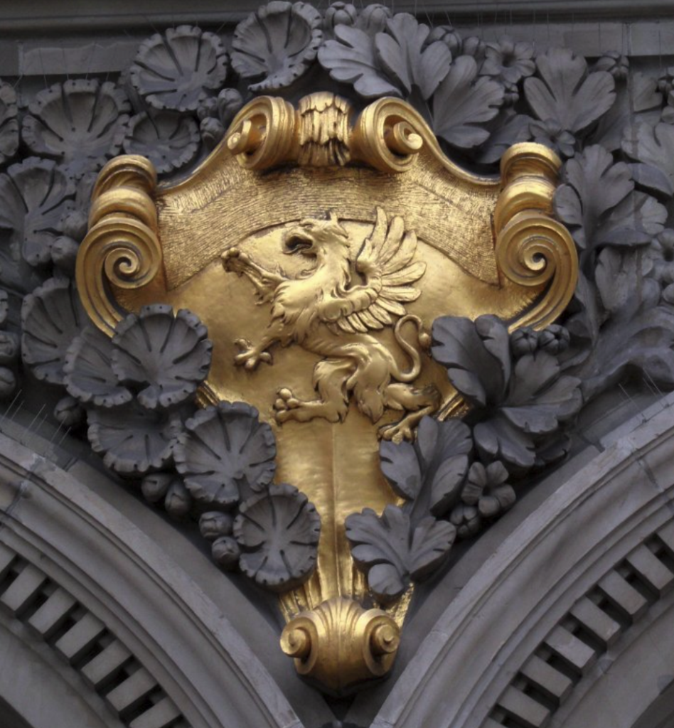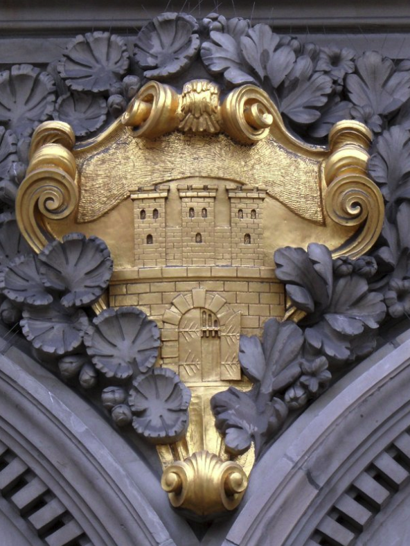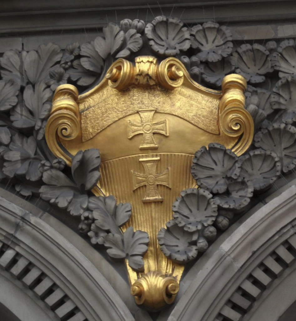 Herby na fasadzie dawnej siedziby oddziału Banku Rzeszy w Gdańsku (1906 r.). Dzisiaj: siedziba Narodowego Banku Polskiego