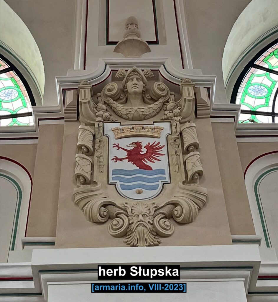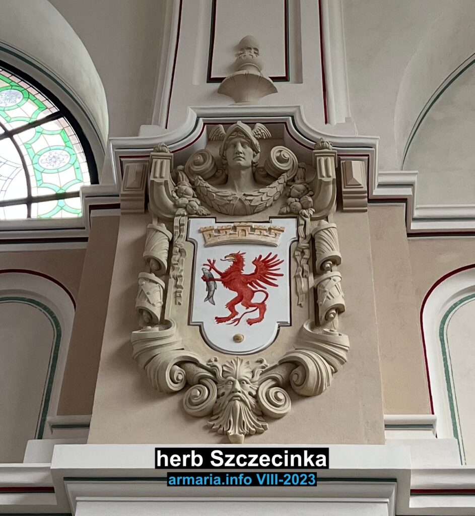 Herb Szczecinka, przedstawiono w pierwotnej formie, innej niż obowiązująca dzisiaj.