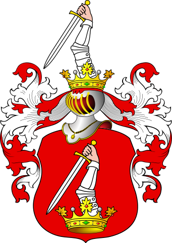 Herb złożony, dwupolowy, należący do osoby świeckiej. W polu prawym (heraldycznie) — godło przypominające uproszczony herb Radwan (w polu czerwonym chorągiew złota kościelna, o trzech polach, z frędzlami u dołu z zaćwieczonym na wierzchu takimż krzyżem kawalerskim). W polu lewym ręka zbrojna wychodząca z korony, z mieczem lub sztyletem w charakterystycznym uchwycie wyobrażającym pchnięcie w dół. Herbem z podobnym godłem (ręka zbrojna z mieczem nad koroną) pieczętowała się m.in. szlachecka rodzina Brandysów. W klejnocie, nad hełmem w koronie, który może sugerować szlachecką proweniencję herbu (może, ale na tle licznych w Gdańsku wyjątków — nie musi) — powtórzenie godła ze zbrojną ręką z mieczem.