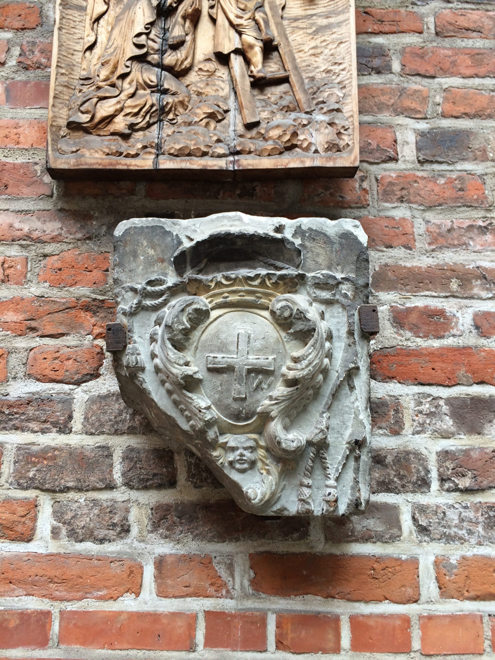 Kartusz z herbem Dębno: w polu czerwonym, krzyż srebrny z takąż łękawicą pod lewym ramieniem. Korona nad tarczą herbową i godło świadczą o tym, że mamy do czynienia z herbem szlacheckim. Kapelusz i chwosty oznaczają, że jest to wizerunek herbu osoby duchownej. Elementy typowe dla heraldyki kościelnej, jak liczba chwostów na sznurach kapelusza oraz emblematy zdobiące herb (krzyż, miecz, pastorał), pozwoliłyby na ustalenie miejsca w hierarchii kościelnej jaką zajmował właściciel tego herbu i fundator reliefowej rzeżby. Niestety, stopień uszkodzenia zabytku nie pozwala tego ustalić.