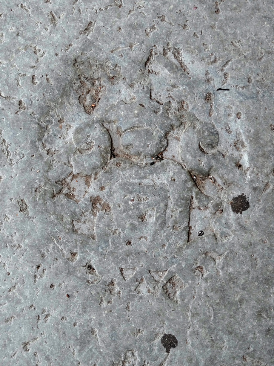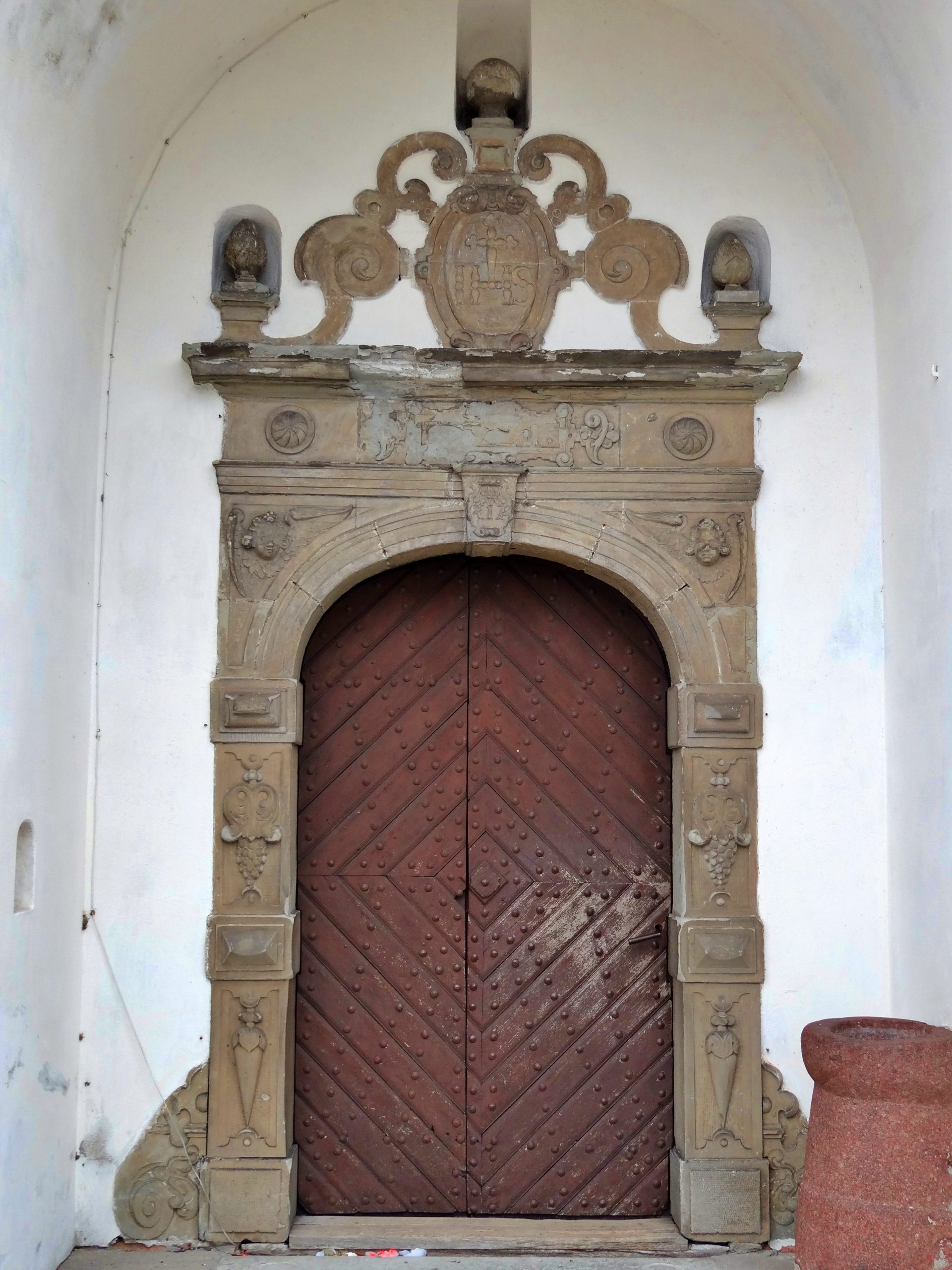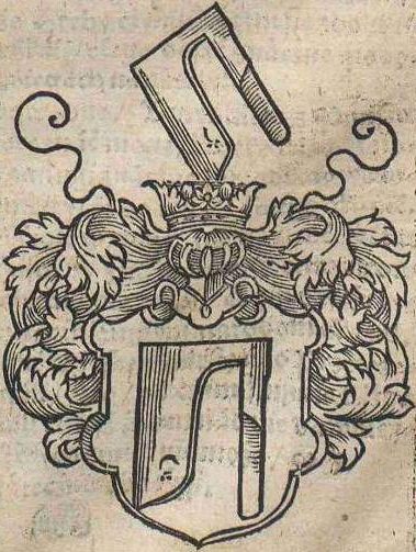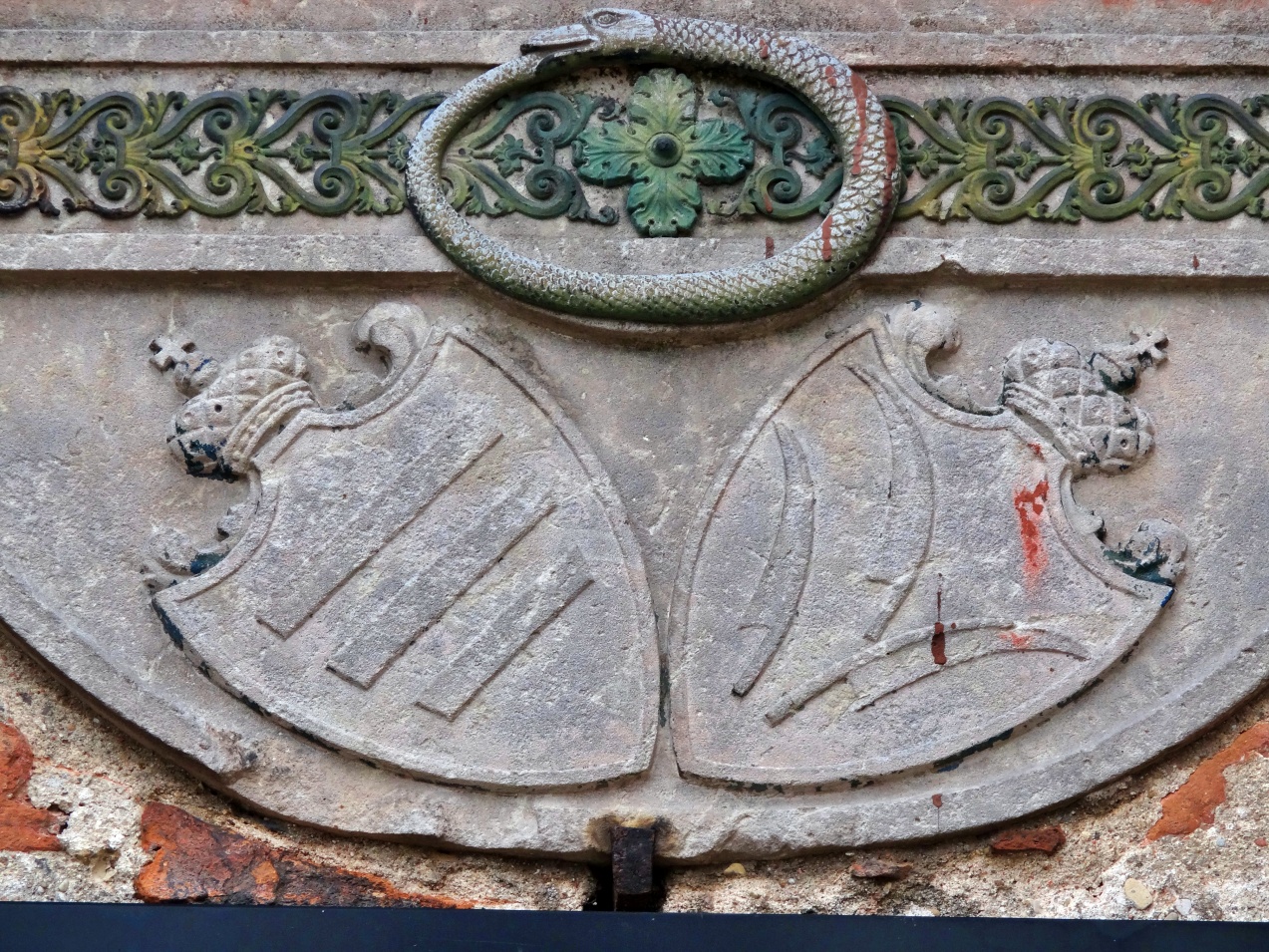Na epitafium widnieją dwa kartusze herbowe. Na zdjęciu po lewej (heraldycznie prawej) — herb Kalkstein rodu Osłowskich (Osłowscy z Osłowa są gałęzią Kalksteinów). Na przeciwko — zagadkowy herb, zapewne Wolskich (?). Kartusze wieńczą korony w formie ksiażęcej mitry zwieńczonej krzyżem. To zaskakująca ozdoba, ponieważ z całą pewnością ani Wolscy, ani Osłowscy nie uzyskały tytułu książęcego, który uzasadniałby posłużenie się w herbach tego typu koroną rangową zarezerwowaną dla książąt. Herb Wolskich nieco przypomina herb “Kroje”, stanowiące odmianę herbu Rola, którym pieczętowała się hrabiowska rodzina Wolskich w Prusach. Ta zagadka zasługuje na dalsze poszukiwania.
