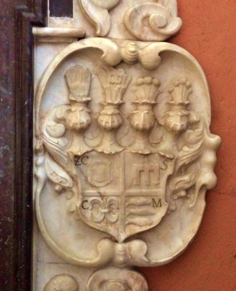 I tak po heraldycznej lewej stronie epitafium mamy kartusz z czteropolową tarczą herbową Zofii Konstancji z Sobieskich Szczepańskiej, a w niej: w polu I herb Sobieskich „Janina” (tarcza w tarczy), w polu II herb Gdeszyńskich „Gozdawa” (dwie lilie spojone pierścieniem), w polu III herb Zebrzydowskich „Radwan” (chorągiew kościelna o trzech strefach z zaćwieczonym krzyżem) oraz herb „Korzbok” (trzy karpie w pas czyli w pionie). Nad poszczególnymi polami tarczy herbowej inicjały „ZC.-S.-C.-M” czyli: „Zophia Constantia – Sczepanska – capitanea – Mierachoviensis” (Zofia Konstancja Szczepańska starościna mirachowska).