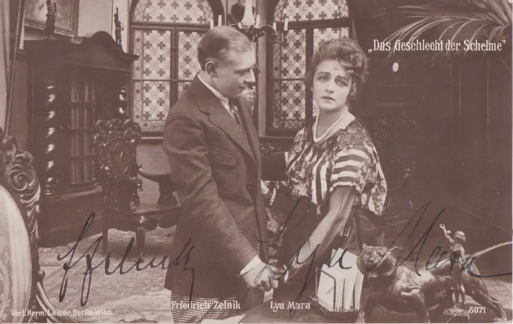 Kadr z filmu niemego “Das Geschlecht der Schelme” z 1917 r. na motywach książki Fedora von Zobeltitz.    W rolach głównych wystąpiły gwiazdy niemieckiego kina niemego: Friedrich Zelnik i Lya Mara (w prywatnym życiu byli małżeństwem). Pełen rozmachu, brawurowy scenariusz to historia odrzuconego konkurenta, który z pomocą hipnotyzera próbuje odzyskać ukochaną pogrążając jej męża – fałszywego arystokratę ukrywającego przestępczą przeszłość w Nowym Jorku. Film zawiera wszystkie obowiązkowe elementy gatunku: intrygi, nagłe zwroty akcji, romans, nieszczęśliwą miłość i zazdrość. Lya Mara, gwiazda niemieckiego kina niemiego urodziła się w polskiej rodzinie w Rydze jako Aleksandra Gudowiczówna.